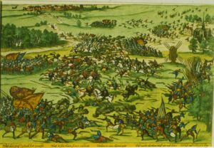 1574: De Slag op de Mookerheide vond plaats aan het einde van Oranjes derde invasie op 14 april 1574 tussen het Spaanse leger onder Sancho d’Avila en Bernardino de Mendoza enerzijds, en huurtroepen onder Lodewijk en Hendrik van Nassau anderzijds. De veldslag was een Spaanse overwinning en zowel Lodewijk als Hendrik van Nassau sneuvelde.