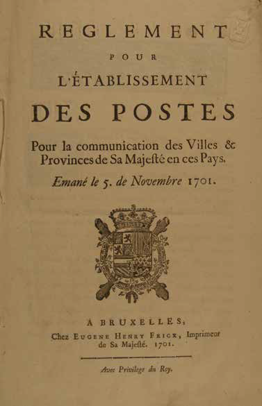 In Brussel was Eugène Henry Fricx drukker voor Thurn en Taxis. In 1701 verscheen bij hem het reglement der Keizerlijke posterijen met ondermeer de trajecten, de relaisplaatsen en verdere bijzonderheden in de Nederlanden.