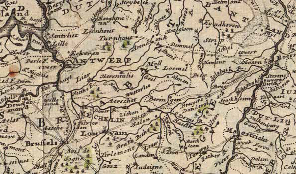 1729: Postkaart uit 1729 van Mol met o.m. de postroute naar Engeland.
