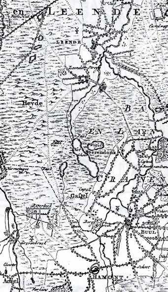 Bemerk het belangrijke gehucht Beverbeek, de Kluis en de diverse molens. De kaart maakt ook de melding van diverse posthutten.