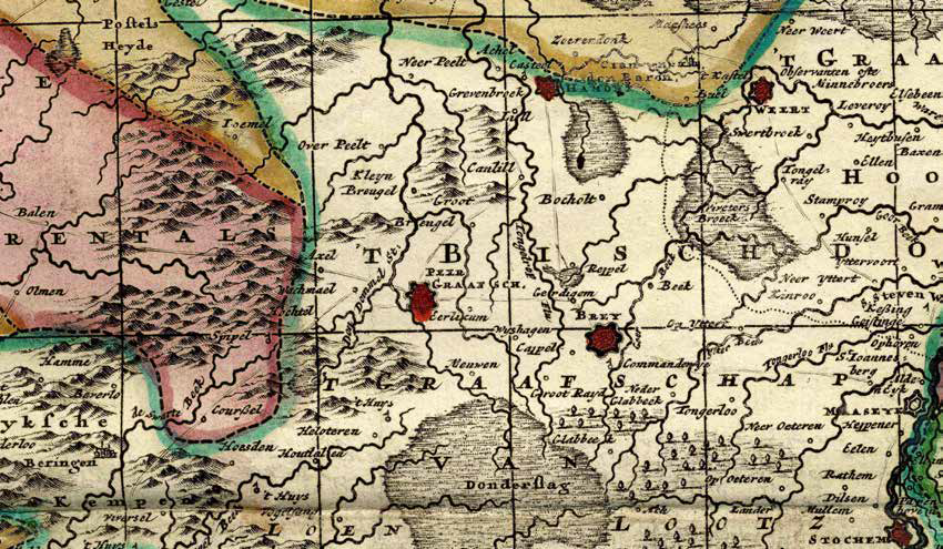 1750: Kaart van Peter Schenck van rond 1750. Hierop is vooral de weg tussen Hamont, Bree en Maaseik duidelijk ingetekend.