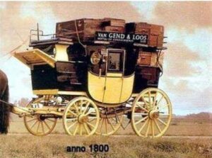 1809: De Postwagen is ontstaan in de 18e eeuw. De koets leek toen nog op een zware boerenwagen en werd gebruikt om van de ene vaste post (pleisterplaats of uitspanning) naar de andere te rijden. De families Van Gend en Loos hielden zich bezig met het vervoer van goederen en personen met deze wagens. Tijdens de bezetting van Napoleon werden stenen straten aangelegd op de doorgaande routes tussen de belangrijkste steden. In 1809 gingen de beide families daarom samen verder en brachten een nieuwe wagen met een dubbele cabine op de markt voor het reizigersvervoer, de Diligence. Met de komst van de stoomtrein eind 19e eeuw stopt Van Gend & Loos echter met deze activiteit.