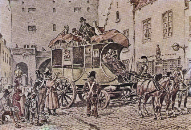 1825: De Hallepoort in Brussel in 1825, aankomst van een postkoets, tekening James Thirair.