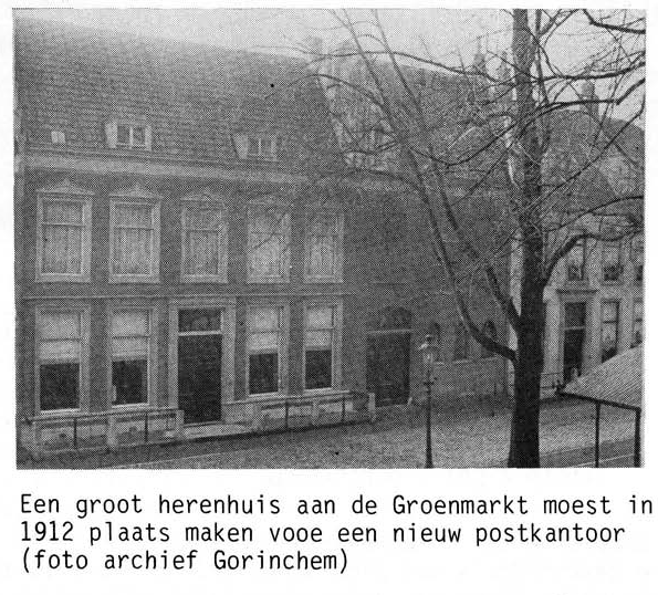 1881: Het postkantoor kreeg in de loop der tijden een stijgende stroom poststukken te verwerken. Waren het er 157.348 in 1870, tien jaren later was het aantal brieven meer dan verdubbeld. Van de zijde van de posterijen werd dan ook geinformeerd, of er van gemeentewege bereidheid bestond het postkantoor uit te breiden of een ruimer gebouw beschikbaar te stellen, omdat de toestand onhoudbaar was geworden. Het gemeentebestuur reageerde afwijzend, omdat het Rijk voor voldoende ruimte diende te zorgen. Er bleef geen andere weg open, dan het gemeentelijk gebouw waarin het postkantoor was gevestigd aan te kopen. Van de zijde van de gemeente bestond daartegen allerminst bezwaar en medio 1881 besloot de gemeenteraad tot de verkoop van het gebouw aan het Rijk voor f 11.000. een noodzakelijke vergroting kocht het Rijk bovendien aangrenzende particuliere pand aan de Groenmarkt. Aannemer Verweij, die indertijd het postkantoor had gebouwd,kreeg van rijkswege opdracht een ingrijpende verbouwing uit te voeren. Het naastgelegen huis werd erbij ge- trokken en langs de Groenmarkt verrees een geheel nieuwe gevel van baksteen. Met gebruikmaking van verschillende soorten steen werd een figuratie in de gevelwand aangebracht. De ingang werd verplaatst naar de rechterzijde naast de Tinnegietersteeg. Weer later zou die deur door een venster worden vervangen, wat nog is te zien aan de stenen onder het raam; de toegangsdeur kwam toen in de Tinnegietersteeg, maar de postdienst had het gebouw toen al verlaten. In de gevel werd een grote gemetselde